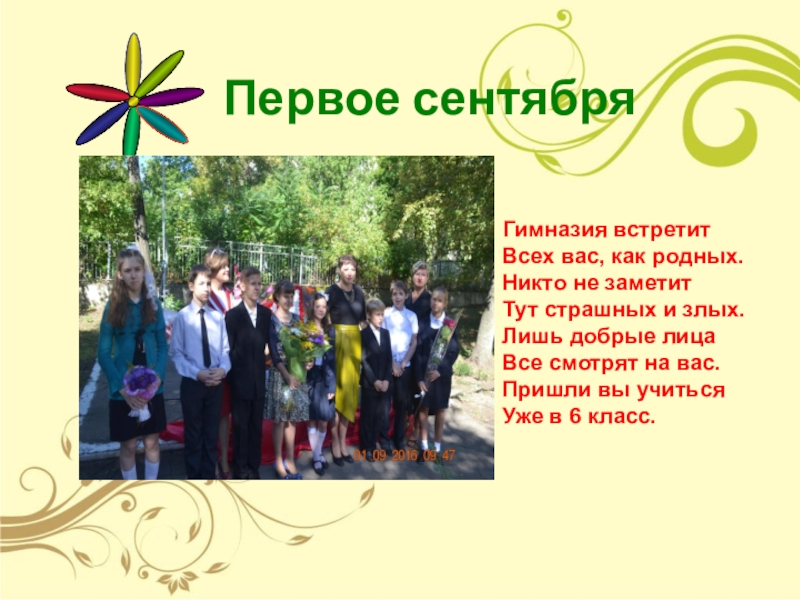 Первое сентябряГимназия встретит Всех вас, как родных. Никто не заметит Тут страшных и злых. Лишь добрые лица