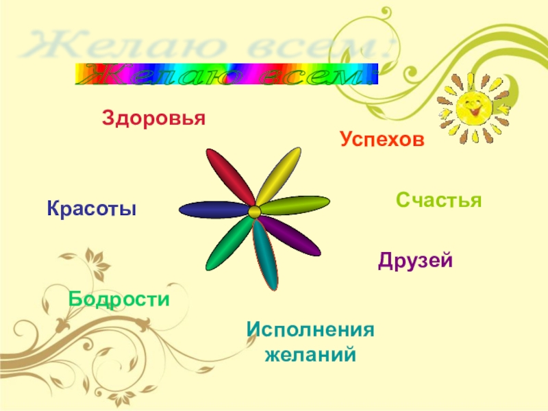 БодростиЗдоровьяУспеховСчастьяДрузейИсполнения желанийКрасотыЖелаю всем: