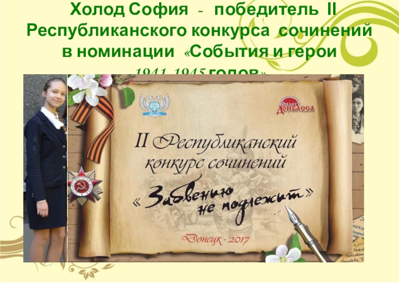 Слайд 44 Холод София - победитель ІІ Республиканского конкурса сочинений в