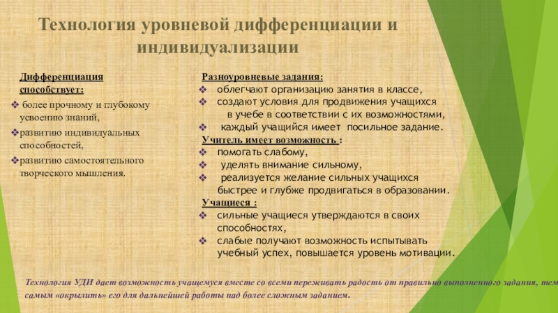 Технология УДИ дает возможность учащемуся вместе со всеми переживать радость от правильно выполненного задания, тем самым «окрылить» его для дальнейшей работы над более сложным заданием.