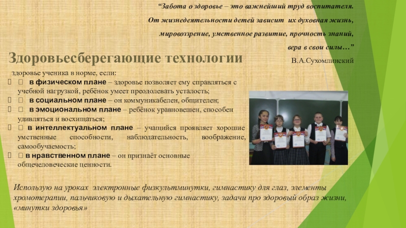 Использую на уроках электронные физкультминутки, гимнастику для глаз, элементы хромотерапии, пальчиковую и дыхательную гимнастику, задачи про здоровый образ жизни, «минутки здоровья»