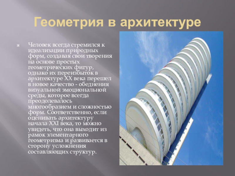 Геометрия в архитектуреЧеловек всегда стремился к идеализации природных форм, создавая свои творения на основе простых геометрических фигур,