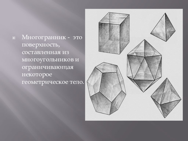 Слайд 2Многогранник - это поверхность, составленная из многоугольников и ограничивающая некоторое геометрическое