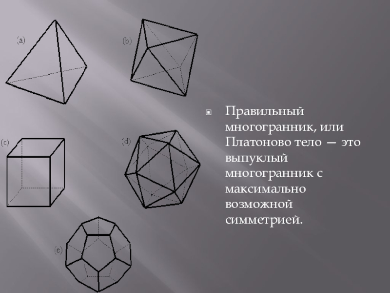 Слайд 4Правильный многогранник, или Платоново тело — это выпуклый многогранник с максимально