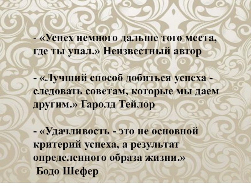 - «Успех немного дальше того места, где ты упал.» Неизвестный автор - «Лучший способ добиться успеха