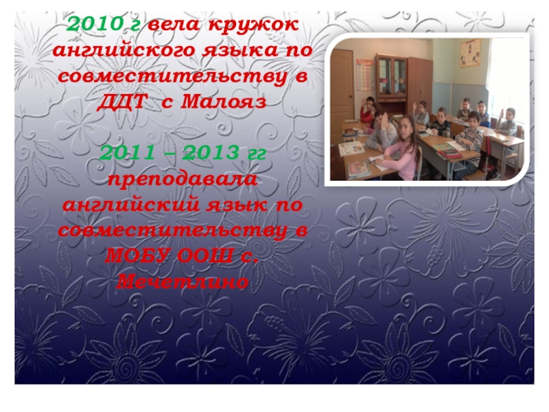 2010 г вела кружок английского языка по совместительству в ДДТ с Малояз2011 – 2013 гг преподавала английский