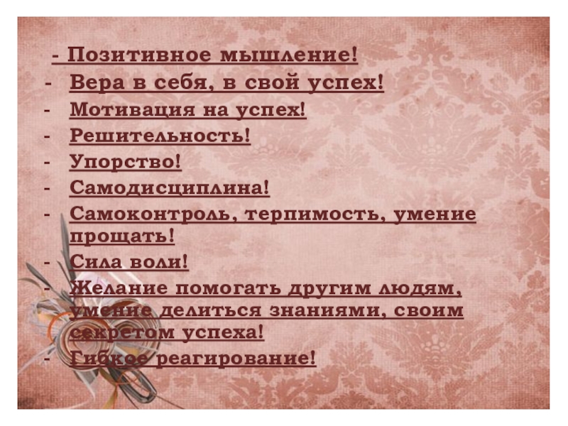 - Позитивное мышление!Вера в себя, в свой успех!Мотивация на успех!Решительность!Упорство!Самодисциплина!Самоконтроль, терпимость, умение прощать!Сила воли!Желание помогать другим людям,умение