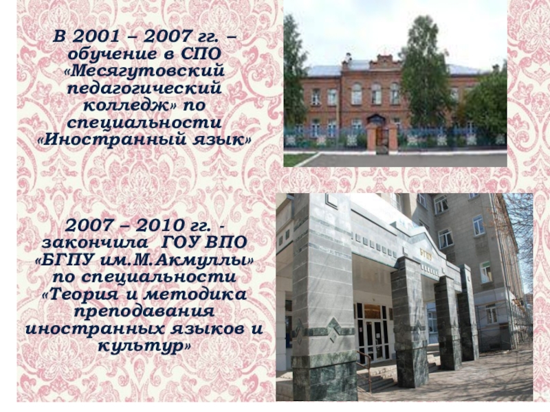 Слайд 5В 2001 – 2007 гг. – обучение в СПО «Месягутовский педагогический