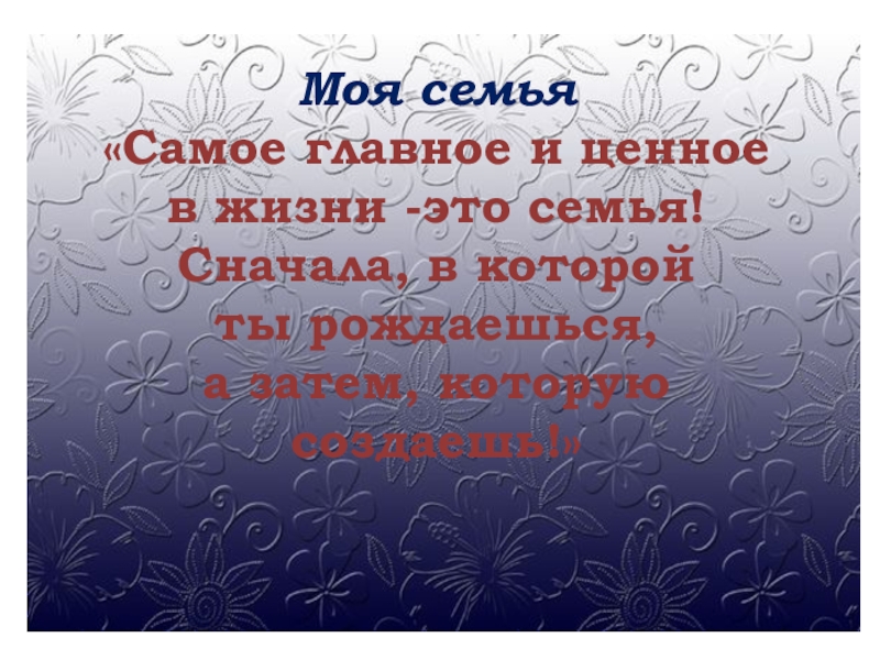 Моя семья«Самое главное и ценное в жизни -это семья! Сначала, в которой ты рождаешься, а затем, которую создаешь!»