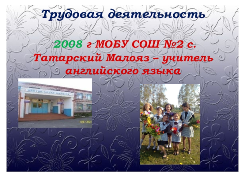 Трудовая деятельность 2008 г МОБУ СОШ №2 с. Татарский Малояз – учитель английского языка