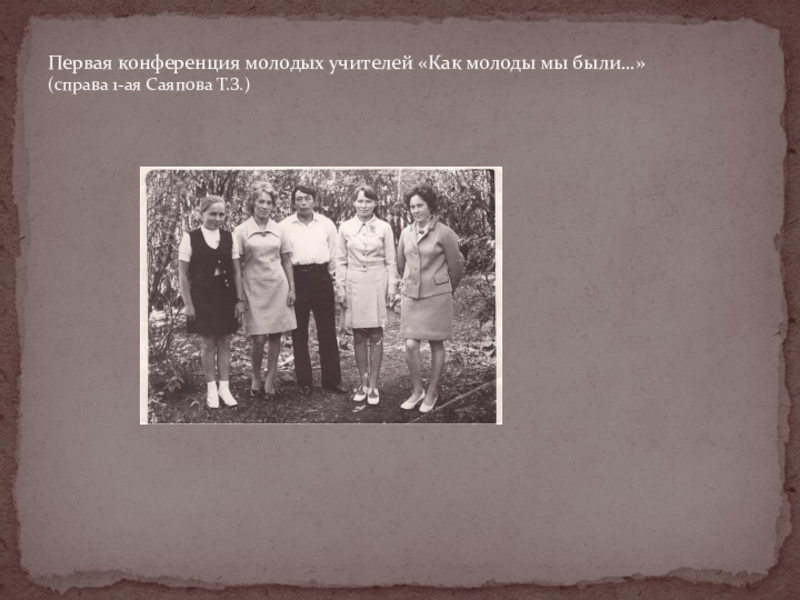 Слайд 19Первая конференция молодых учителей «Как молоды мы были…» (справа 1-ая Саяпова Т.З.)