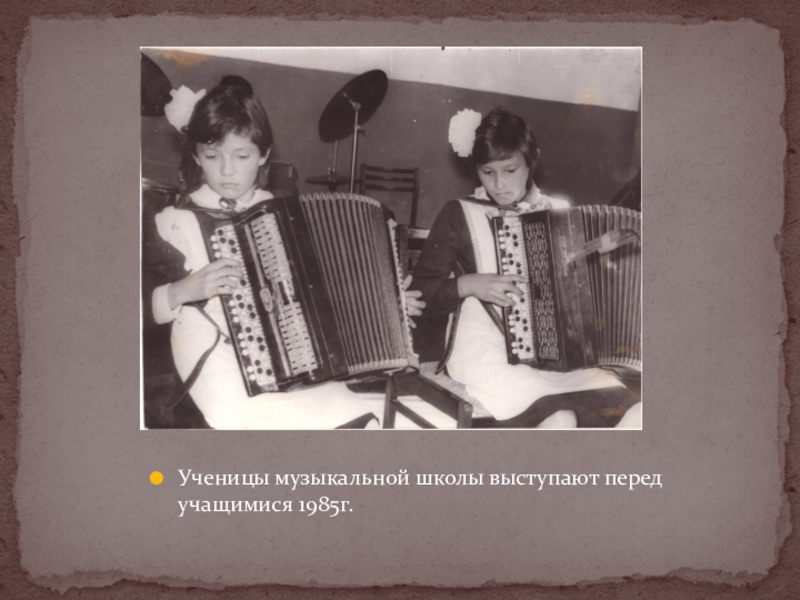 Слайд 7Ученицы музыкальной школы выступают перед учащимися 1985г.
