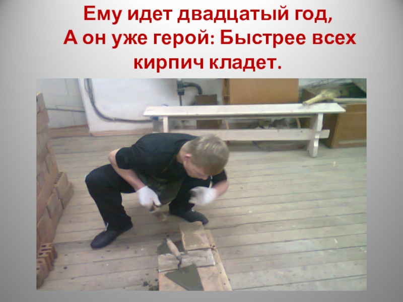Слайд 14Ему идет двадцатый год, А он уже герой: Быстрее всех кирпич
