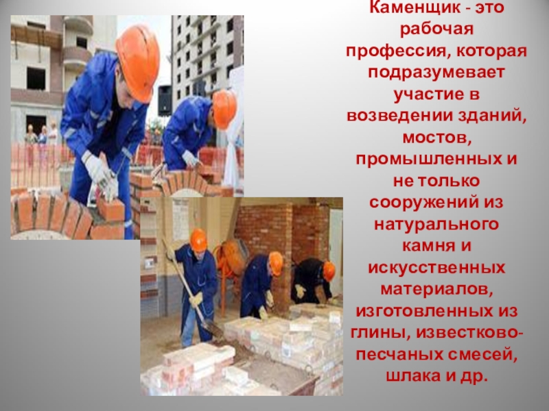 Слайд 2Каменщик - это рабочая профессия, которая подразумевает участие в возведении зданий,
