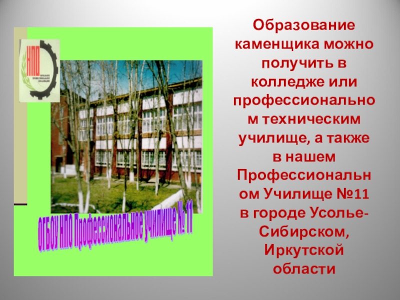 Слайд 10 Образование каменщика можно получить в колледже или профессиональном техническим училище, а