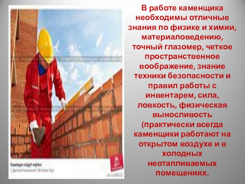 Слайд 4В работе каменщика необходимы отличные знания по физике и химии, материаловедению,
