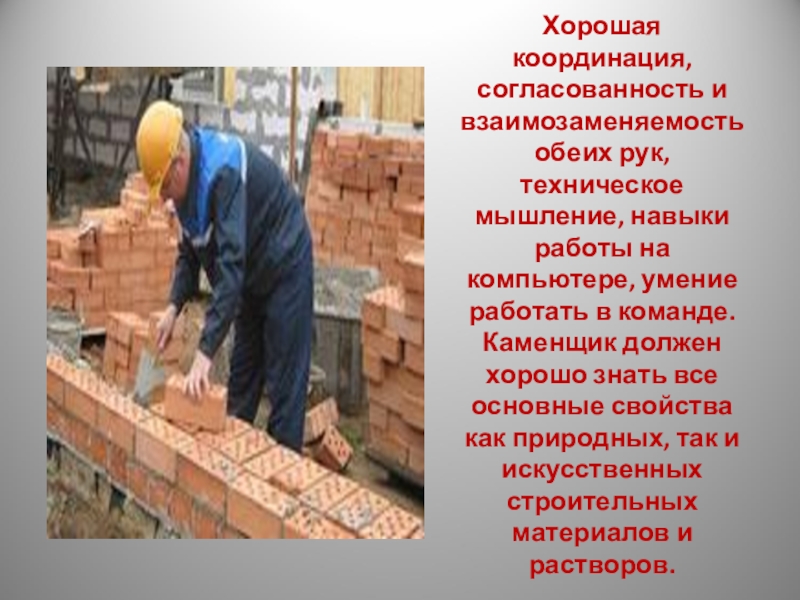 на компьютере, умение работать в команде. Каменщик должен хорошо знать все основные свойства как природных, так и искусственных строительных материалов и растворов.