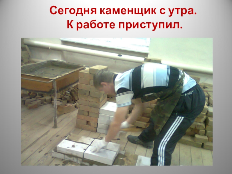 Слайд 13Сегодня каменщик с утра. К работе приступил.