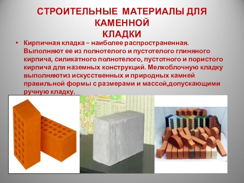 полнотелого и пустотелого глиняного кирпича, силикатного полнотелого, пустотного и пористого кирпича для наземных конструкций. Мелкоблочную кладку выполняютиз искусственных и природных камней правильной формы с размерами и массой,допускающими ручную кладку.