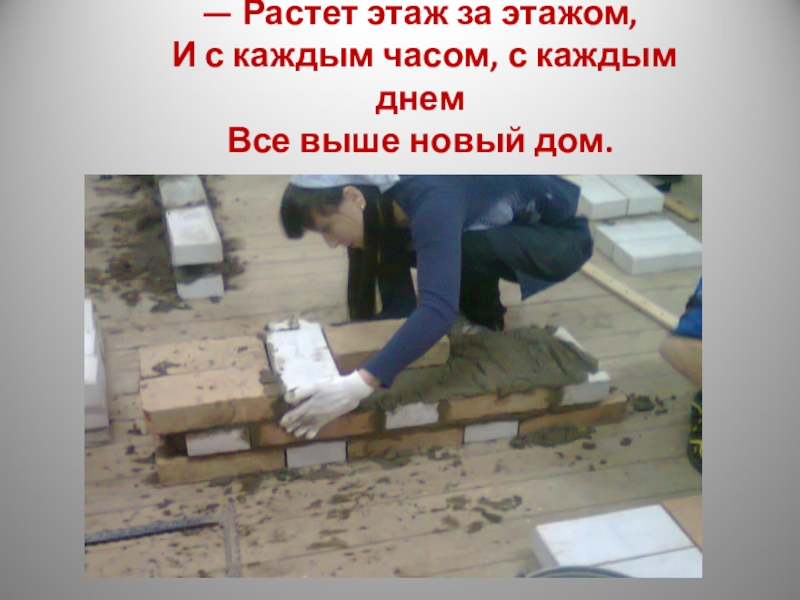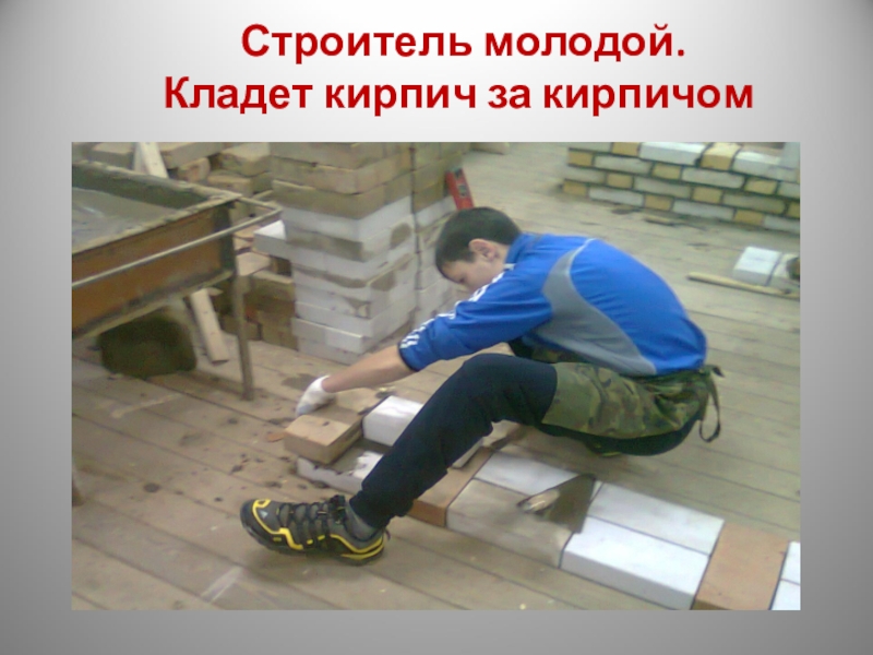 Слайд 15 Строитель молодой. Кладет кирпич за кирпичом