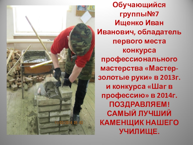 руки» в 2013г.и конкурса «Шаг в профессию» в 2014г. ПОЗДРАВЛЯЕМ! САМЫЙ ЛУЧШИЙ КАМЕНЩИК НАШЕГО УЧИЛИЩЕ.