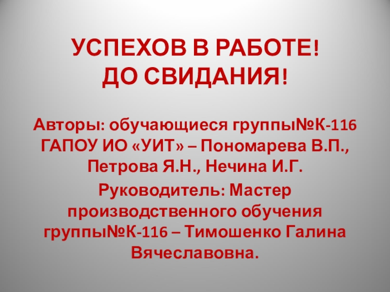 УСПЕХОВ В РАБОТЕ! ДО СВИДАНИЯ!Авторы: обучающиеся группы№К-116 ГАПОУ ИО «УИТ» – Пономарева В.П., Петрова Я.Н., Нечина И.Г.Руководитель: