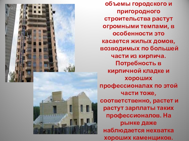 в особенности это касается жилых домов, возводимых по большей части из кирпича. Потребность в кирпичной кладке и хороших профессионалах по этой части тоже, соответственно, растет и растут зарплаты таких профессионалов. На рынке даже наблюдается нехватка хороших каменщиков.