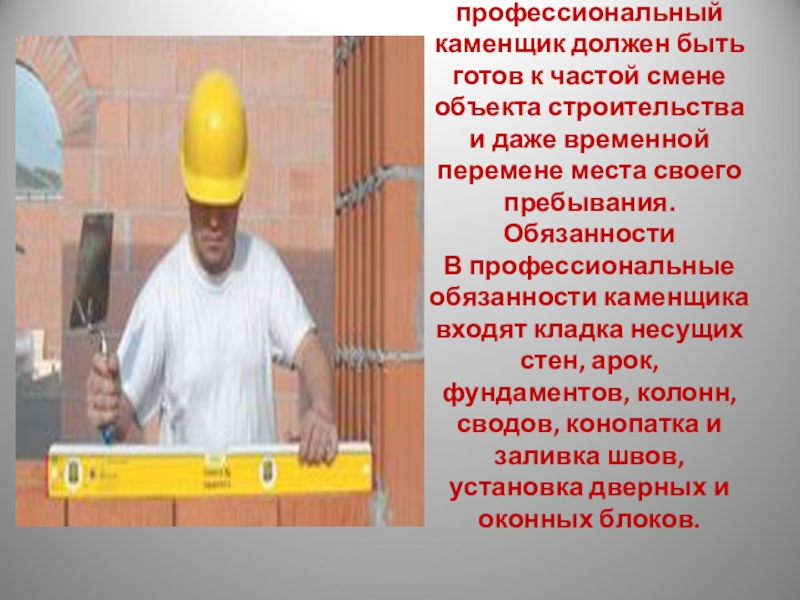 Слайд 6Любой профессиональный каменщик должен быть готов к частой смене объекта строительства