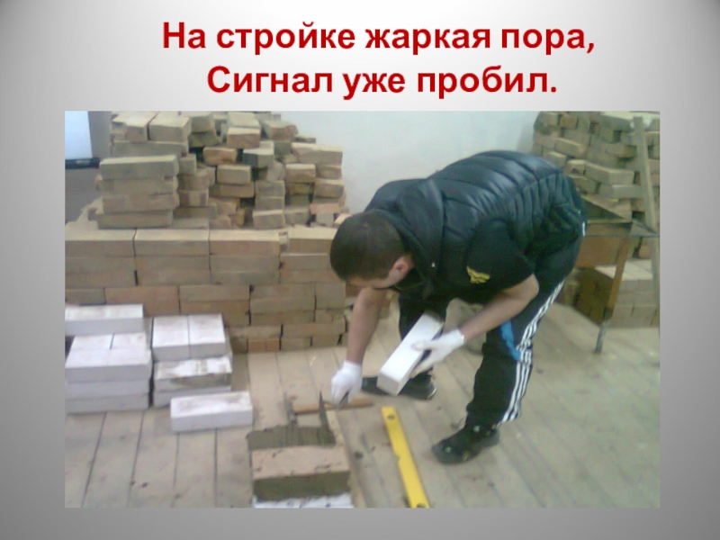 Слайд 12На стройке жаркая пора, Сигнал уже пробил.