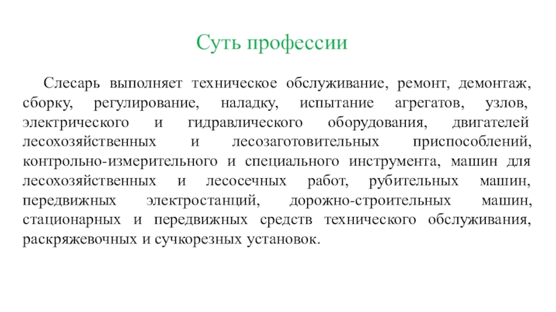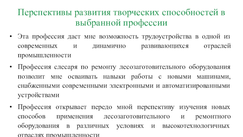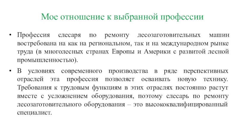 Профессия слесаря по ремонту лесозаготовительного оборудования позволит мне осваивать навыки работы с новыми машинами, снабженными современными электронными и автоматизированными устройствами