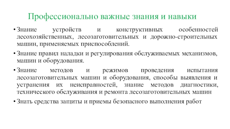 Знание методов и режимов проведения испытания лесозаготовительных машин и оборудования, способы выявления и устранения их неисправностей, знание методов диагностики, технического обслуживания и ремонта лесозаготовительных машин