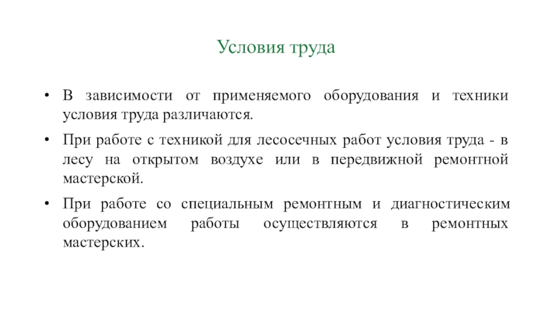 При работе с техникой для лесосечных работ условия труда - в лесу на открытом воздухе или в передвижной ремонтной мастерской.