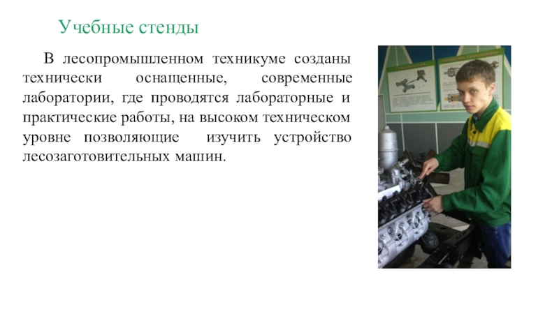 проводятся лабораторные и практические работы, на высоком техническом уровне позволяющие изучить устройство лесозаготовительных машин.