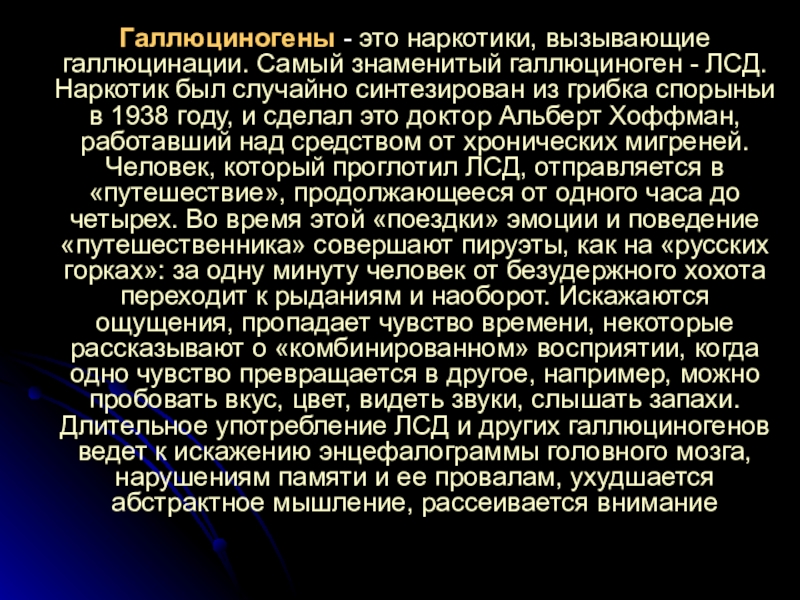 - ЛСД. Наркотик был случайно синтезирован из грибка спорыньи в 1938 году, и сделал это доктор Альберт Хоффман, работавший над средством от хронических мигреней. Человек, который проглотил ЛСД, отправляется в «путешествие», продолжающееся от одного часа до четырех. Во время этой «поездки» эмоции и поведение «путешественника» совершают пируэты, как на «русских горках»: за одну минуту человек от безудержного хохота переходит к рыданиям и наоборот. Искажаются ощущения, пропадает чувство времени, некоторые рассказывают о «комбинированном» восприятии, когда одно чувство превращается в другое, например, можно пробовать вкус, цвет, видеть звуки, слышать запахи. Длительное употребление ЛСД и других галлюциногенов ведет к искажению энцефалограммы головного мозга, нарушениям памяти и ее провалам, ухудшается абстрактное мышление, рассеивается внимание