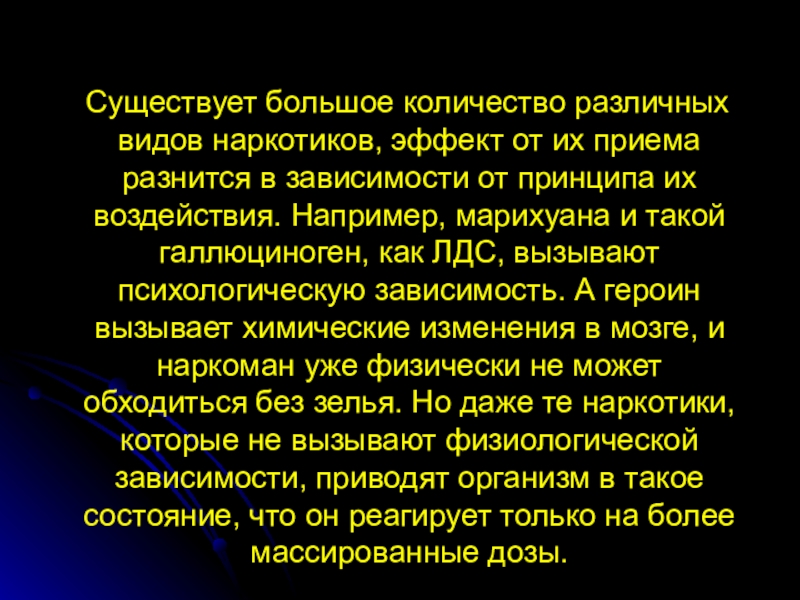 Слайд 4 Существует большое количество различных видов наркотиков, эффект от их
