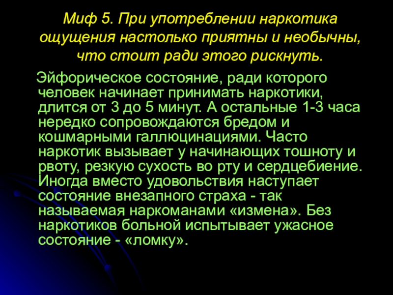 Слайд 17Миф 5. При употреблении наркотика ощущения настолько приятны и необычны, что