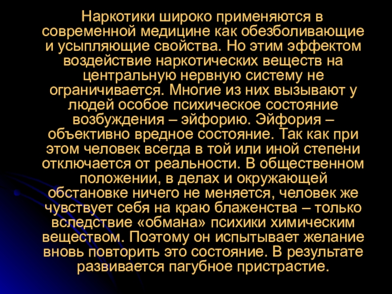 усыпляющие свойства. Но этим эффектом воздействие наркотических веществ на центральную нервную систему не ограничивается. Многие из них вызывают у людей особое психическое состояние возбуждения – эйфорию. Эйфория – объективно вредное состояние. Так как при этом человек всегда в той или иной степени отключается от реальности. В общественном положении, в делах и окружающей обстановке ничего не меняется, человек же чувствует себя на краю блаженства – только вследствие «обмана» психики химическим веществом. Поэтому он испытывает желание вновь повторить это состояние. В результате развивается пагубное пристрастие.