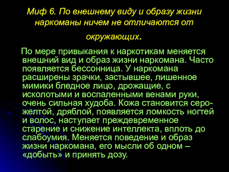 Слайд 18Миф 6. По внешнему виду и образу жизни наркоманы ничем не