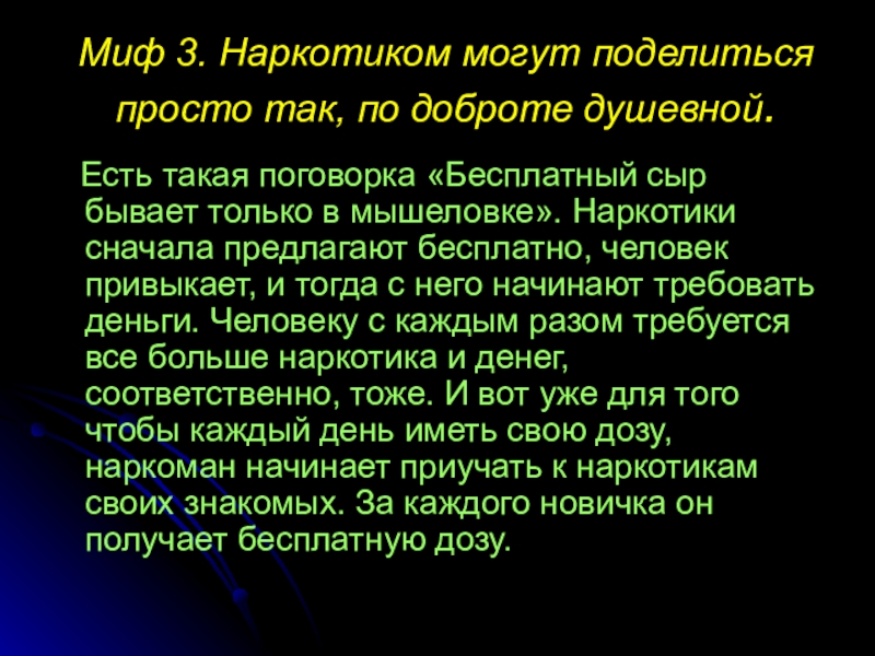 Слайд 15Миф 3. Наркотиком могут поделиться просто так, по доброте душевной.