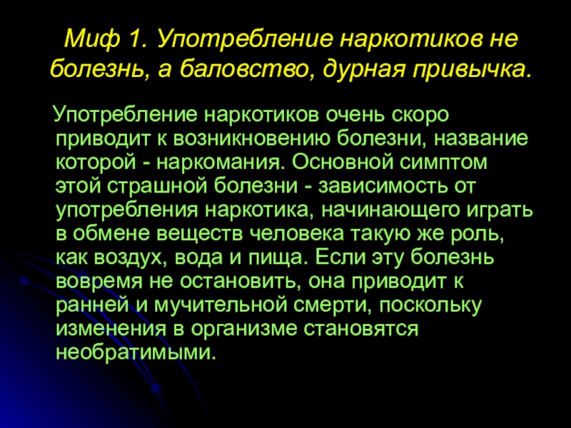 Слайд 13Миф 1. Употребление наркотиков не болезнь, а баловство, дурная привычка.