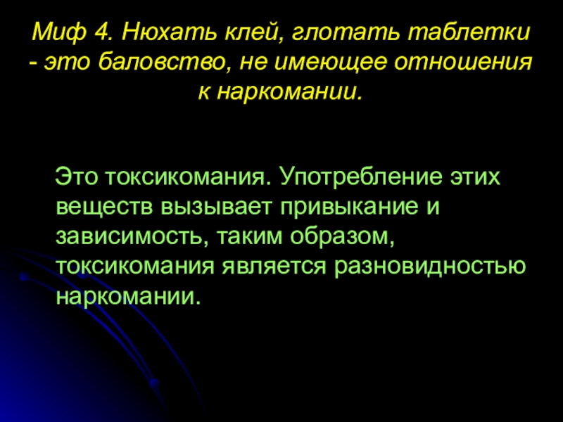 Слайд 16Миф 4. Нюхать клей, глотать таблетки - это баловство, не имеющее