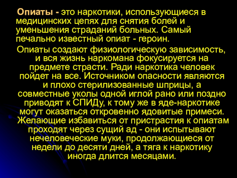 Слайд 10 Опиаты - это наркотики, использующиеся в медицинских цепях для