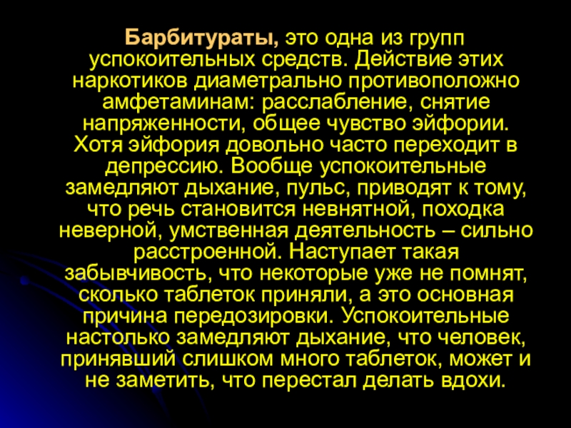 наркотиков диаметрально противоположно амфетаминам: расслабление, снятие напряженности, общее чувство эйфории. Хотя эйфория довольно часто переходит в депрессию. Вообще успокоительные замедляют дыхание, пульс, приводят к тому, что речь становится невнятной, походка неверной, умственная деятельность – сильно расстроенной. Наступает такая забывчивость, что некоторые уже не помнят, сколько таблеток приняли, а это основная причина передозировки. Успокоительные настолько замедляют дыхание, что человек, принявший слишком много таблеток, может и не заметить, что перестал делать вдохи.