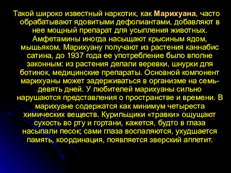 добавляют в нее мощный препарат для усыпления животных. Амфетамины иногда насыщают крысиным ядом, мышьяком. Марихуану получают из растения каннабис сатина, до 1937 года ее употребление было вполне законным: из растения делали веревки, шнурки для ботинок, медицинские препараты. Основной компонент марихуаны может задерживаться в организме на семь-девять дней. У любителей марихуаны сильно нарушаются представления о пространстве и времени. В марихуане содержатся как минимум четыреста химических веществ. Курильщики «травки» ощущают сухость во рту и гортани, кажется, будто в глаза насыпали песок; сами глаза воспаляются, ухудшается память, координация, появляется зверский аппетит.
