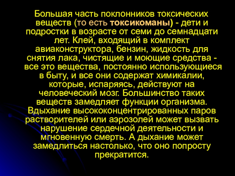 Слайд 11 Большая часть поклонников токсических веществ (то есть токсикоманы) -