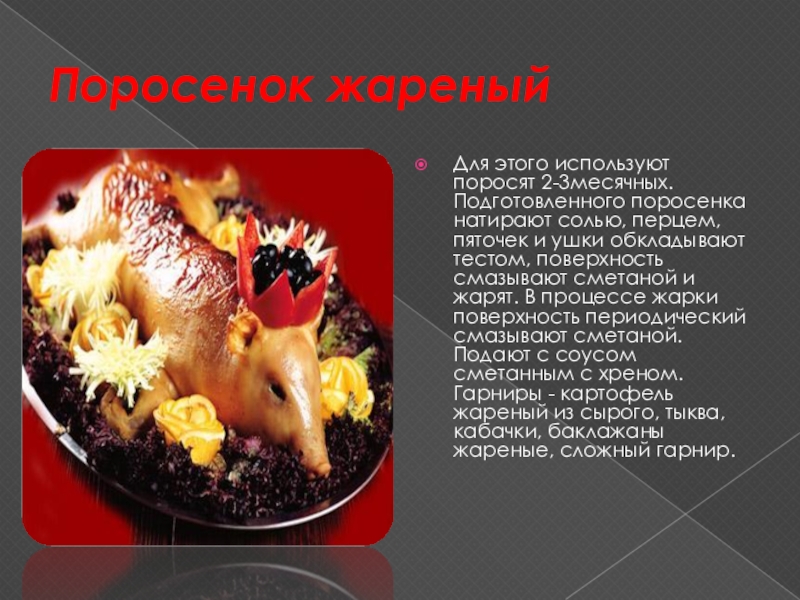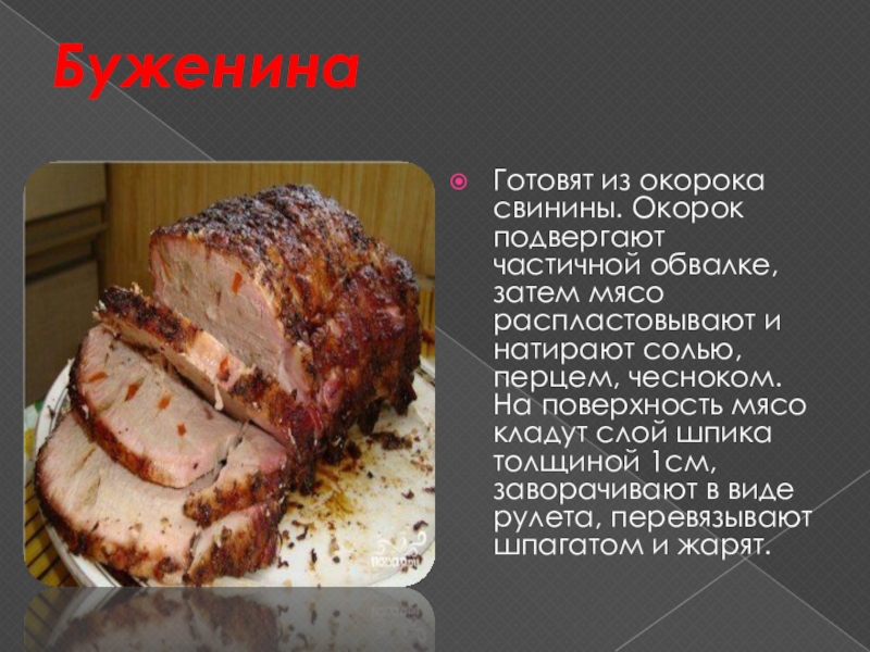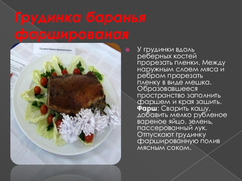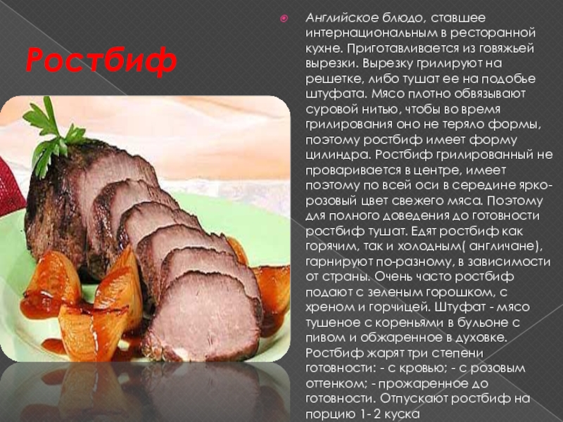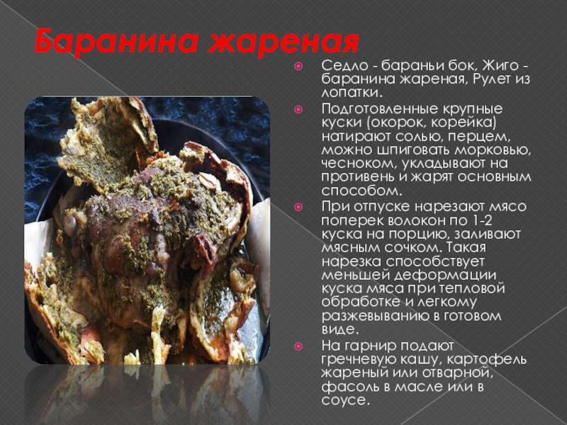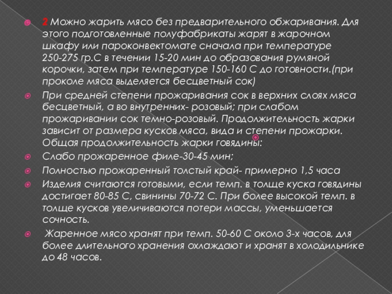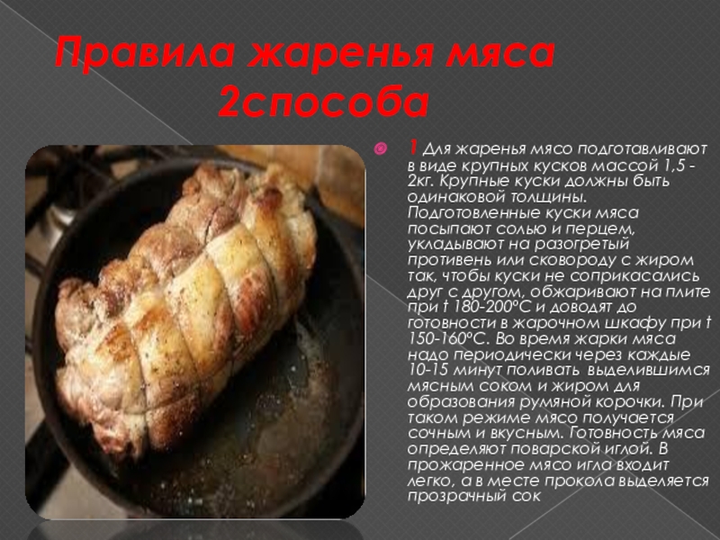 1 Для жаренья мясо подготавливают в виде крупных кусков массой 1,5 - 2кг. Крупные куски должны быть одинаковой толщины. Подготовленные куски мяса посыпают солью и перцем, укладывают на разогретый противень или сковороду с жиром так, чтобы куски не соприкасались друг с другом, обжаривают на плите при t 180-200ºС и доводят до готовности в жарочном шкафу при t 150-160ºС. Во время жарки мяса надо периодически через каждые 10-15 минут поливать выделившимся мясным соком и жиром для образования румяной корочки. При таком режиме мясо получается сочным и вкусным. Готовность мяса определяют поварской иглой. В прожаренное мясо игла входит легко, а в месте прокола выделяется прозрачный сок