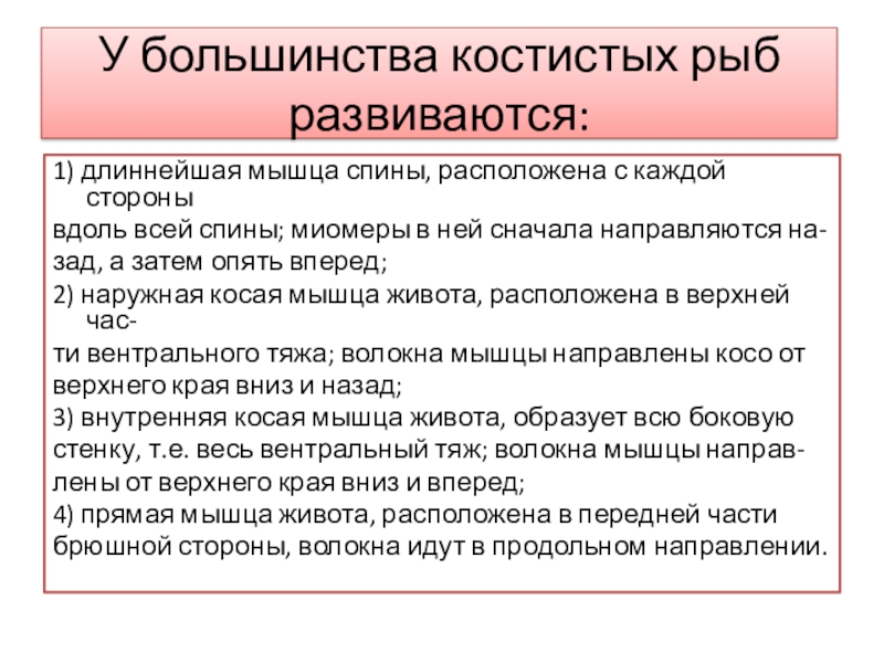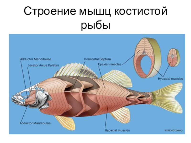 У большинства костистых рыб туловищная мускулатура представлена в основном белыми мышцами.
