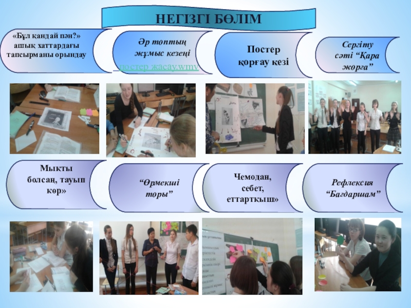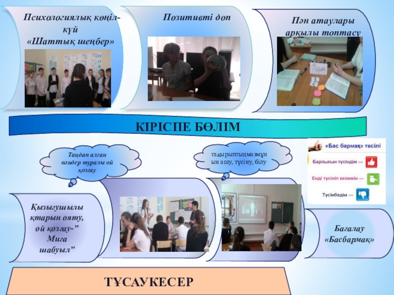 «Шаттық шеңбері», «Позитивті доп», «Пән атаулары», "Миға шабуыл" , «Бұл қандай пән» , «Қара жорға», «Мықты болсаң, тауып көр», «Чемодан, себет, еттартқыш».