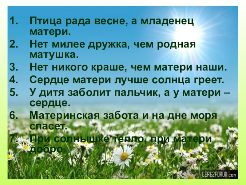 Сердце матери лучше солнца греет.