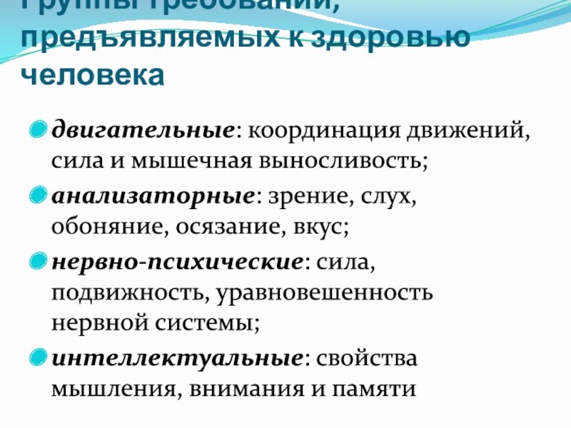 Группы требований, предъявляемых к здоровью человекадвигательные: координация движений, сила и мышечная выносливость; анализаторные: зрение, слух, обоняние, осязание,